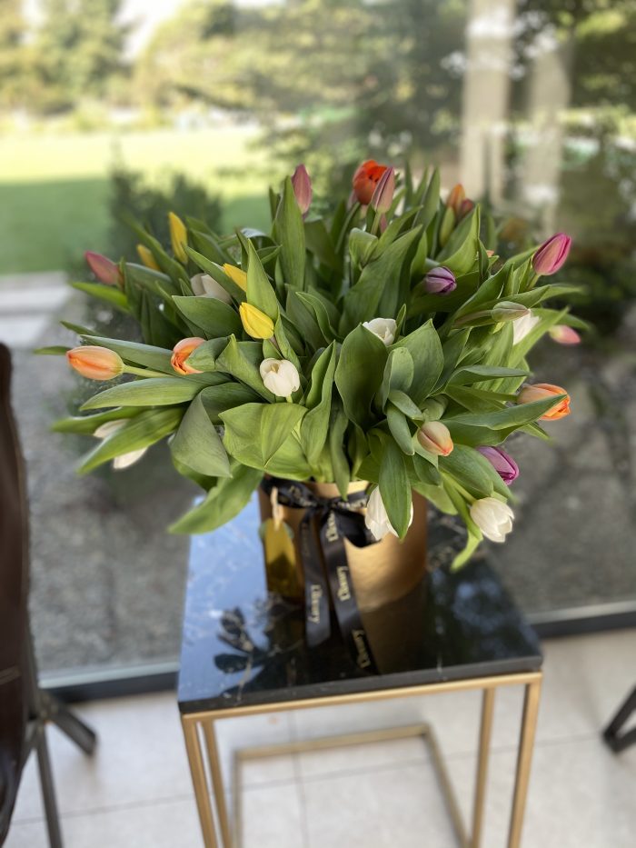 Hermoso y elegante Arreglo de 25 tulipanes de colores en base + caja con ESPUMANTE + doble porción de Bombones Ferrero Rocher (12 unidades).