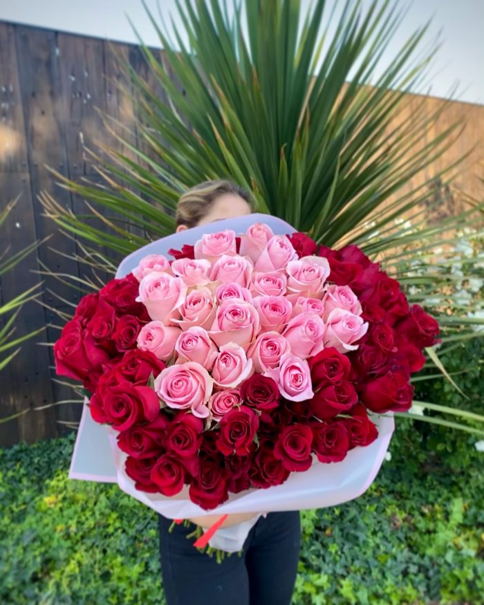 Ramo 100 Rosas Rojas y rosadas Ecuatorianas importadas, Envueltas en Finos papeles + cintas y Tarjeta dedicatoria incluida